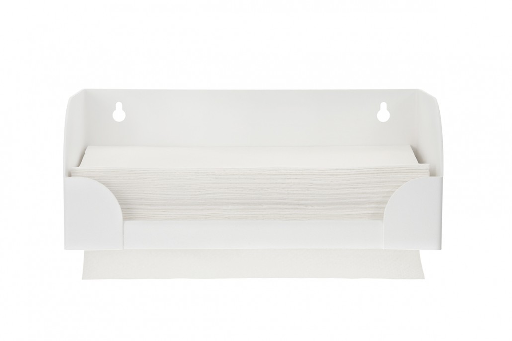 Stabiler Handtuchspender für handelsübliche Falthandtücher mit Z- Faltung. Er besteht aus 1,5 mm starkem Aluminium und ist pulverbeschichtet in RAL 9016 Feinstruktur. Die Außenmaße sind: Breite 25,5 cm, Tiefe 13 cm, Höhe 10 cm. Die offene Bauweise ermöglicht ein direktes und schnelles Bestücken mit den Papierhandtüchern. Durch seine besondere Konstruktion am Boden liegen die Pakete leicht gewölbt und die Tücher lassen sich leicht einzeln nach unten herausziehen. Zwei Löcher an der Rückseite ermöglichen die Wandmontage.