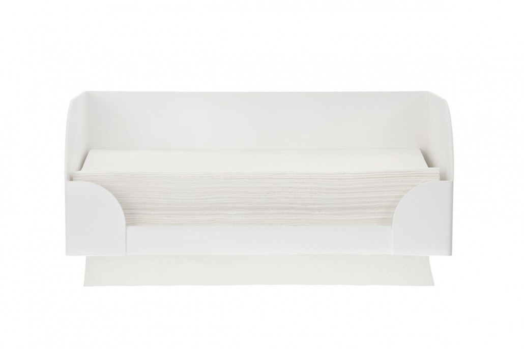 Stabiler Handtuchspender für handelsübliche Falthandtücher mit Z- Faltung. Er besteht aus 1,5 mm starkem Aluminium und ist pulverbeschichtet in RAL 9016 Feinstruktur. Die Außenmaße sind: Breite 25,5 cm, Tiefe 13 cm, Höhe 10 cm. Wegen der offene Bauweise ist ein direktes und schnelles Bestücken möglich. Durch seine besondere Konstruktion am Boden liegen die Pakete leicht gewölbt. Dadurch lassen sich die Tücher leichter einzeln nach unten herausziehen. Dieser Spender ist vorgesehen für den Einbau (einkleben) in einen Hängeschrank, Regal oder ähnliches.