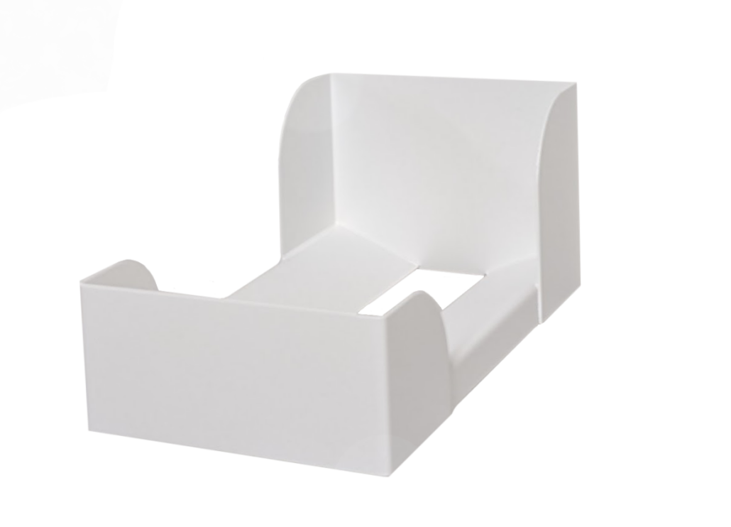 Eine zweiteilige Klemme zum festen Halt der Verpackungen zur Entnahme von Handschuhen, Mundschutz oder Servietten. Sie ist geeignet für Verpackungshöhen von 6 bis 10cm – somit ist ein Produktwechsel jederzeit möglich (für höhere Verpackungen einfach höher platzieren). Die Klemme ist vorgesehen zum Ankleben + Anschrauben (von hinten oder von vorn siehe Auswahl) an eine 3mm starke Rückwand oder Montage an eine Seitenwand bzw. 19 mm starken Rückwand (mit Senkungen in der Aufnahmeplatte um diese von vorn anschrauben zu können).